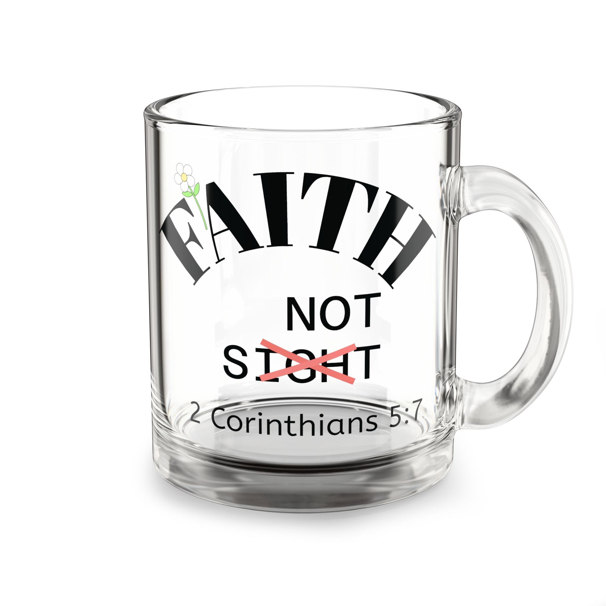 Great reminder each day that we live by what God says and not by what we see or feel/ Start your mornings right with our sleek glass coffee mug, designed to showcase your favorite brew. Made from durable, heat-resistant glass, this mug is as sturdy as it is stylish. With a comfortable, easy-grip handle and a generous 10-ounce capacity, it's perfect for savoring hot coffees, teas, or iced beverages. The clear glass adds a touch of elegance to your drink, letting you enjoy every sip with a view. Elevate your coffee routine with this modern classic!